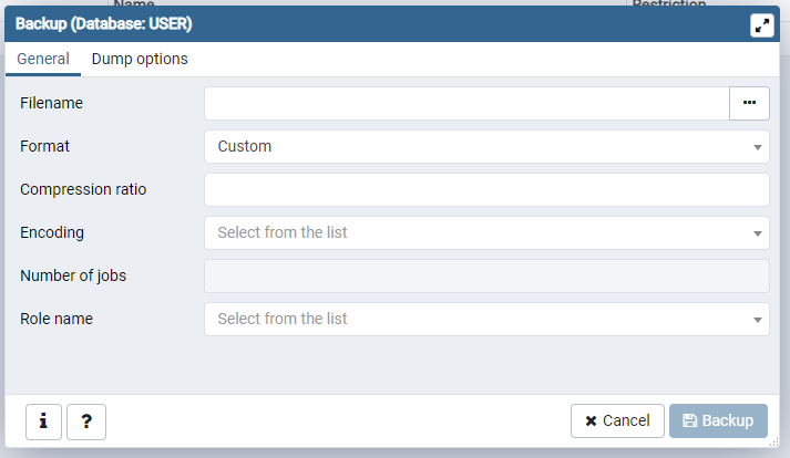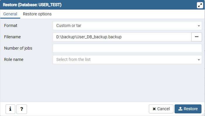 Filename을 먼저 작성합니다. 저는 local에서 User_DB_backup.backup이라는 파일을 미리 생성해 두었습니다.